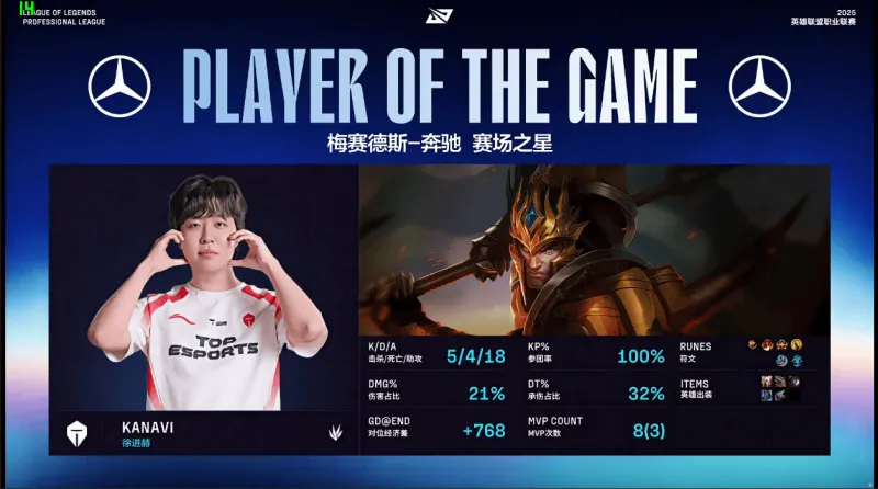 华体会官方平台-Kanavi使用皇子打出5/4/18战绩,斩获TES对阵WBG第二局MVP