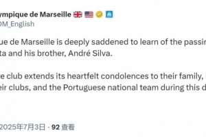 马赛社媒写道:“马赛俱乐部对若塔和他的兄弟安德烈-席尔瓦的去世深感悲痛。在这个艰难时刻,马赛全体成员向他们的家人、亲友、俱乐部和葡萄牙国家队致以最诚挚的慰问。”